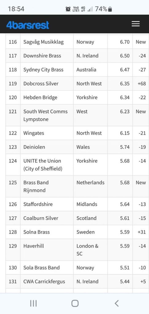 Extract from world rankings recently published on official 4 Bars Rest site. Not sure how they are worked out as not sectional but they do evidence the fantastic progress that the Silver Band continues to make under the guidance of MD Jason Smith. The rise of 68 places is clearly a result of a succession of winning contest performances throughout 2023. Onwards and Upwards for this great team!!