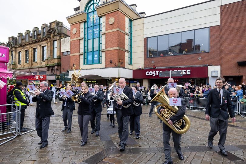 The Band were performing once again yesterday, rather different surroundings, leading the annual Oldham Christmas Parade in the Town Centre. The unpleasant weather didnt deter the many thousands who came out to watch as always. The event always features a variety of entertainment and precedes the Christmas Lights Switch On later in the day.