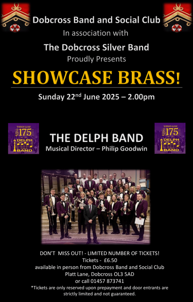 Come and support our local neighbours, The Delph Band, for an afternoon of showcase brass at the award winning Dobcross Band Club hosted by the prize winning Dobcross Silver Band – As always, don’t forget to book your seats in advance!